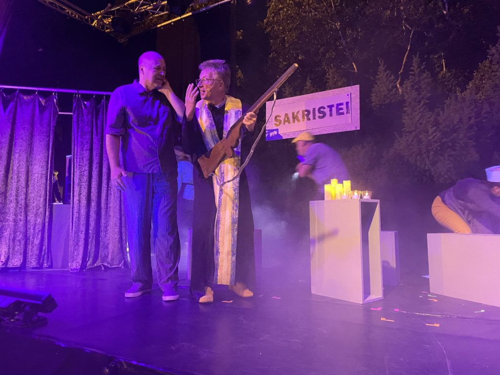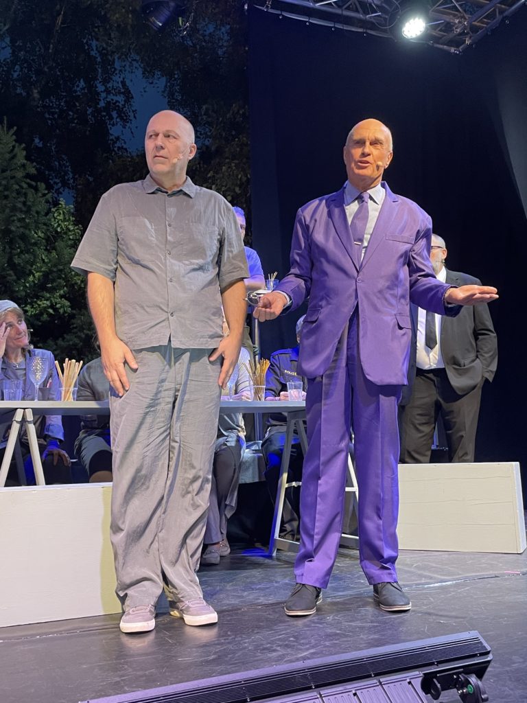 Als neue Eigenproduktion hatten wir 2025 „Der Besuch der alten Dame“ von Friedrich Dürrenmatt auf dem Programm. Darüber hinaus gab es, unserer Hugo von Hofmannsthal Tradition folgend und ihm zu Ehren, eine Sonntagsmatinee mit seinen Texten. Wir haben uns gefreut, für Sie auch Yasmina Rezas Erfolgsstück „Gott des Gemezels“, sowie „Betrogen“ von Harold Pinter auf dem Rodauner Kirchenplatz zu spielen. Erstmals gab es auch Theater für Kinder. Dazu aber mehr weiter unten im Text. Es war ein bunter und spannender Rodauner Theater Sommer 2025!