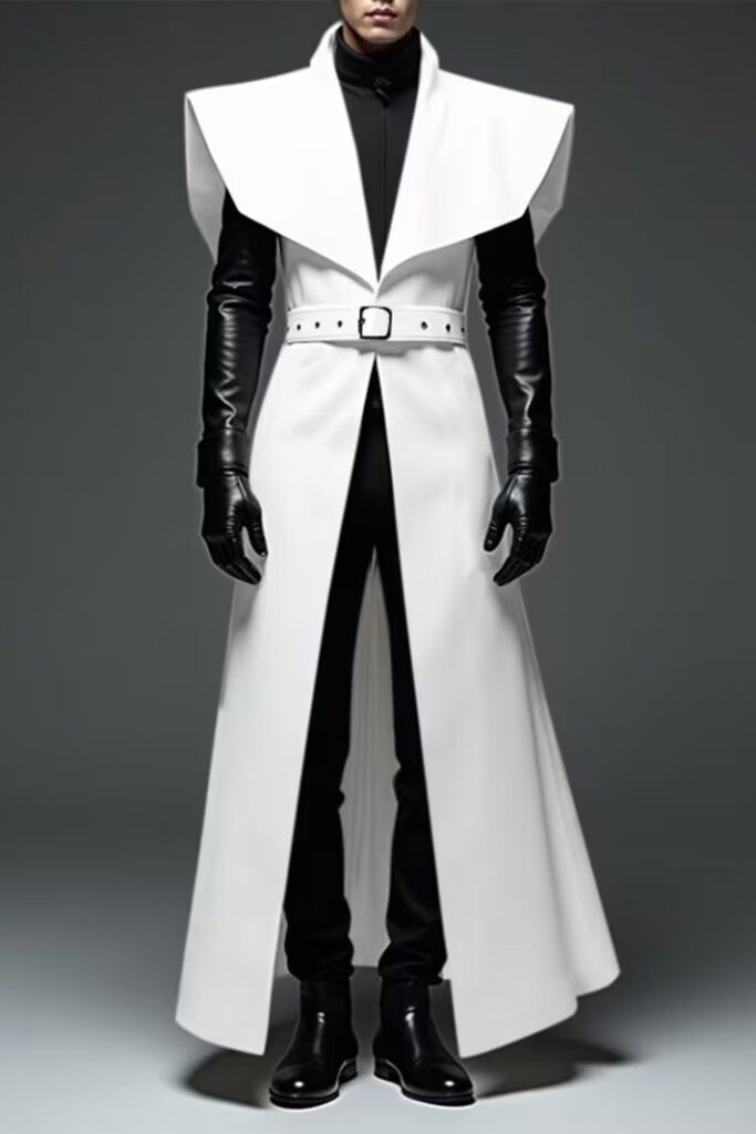 Glatte, leicht glänzende Stoffe (fast klinisch) im Kontrast zu raueren, „menschlicheren“ Materialien. Auch das könnte die Spannung zwischen Funktion und Persönlichkeit sichtbar machen. - Bewegung im Kostüm: